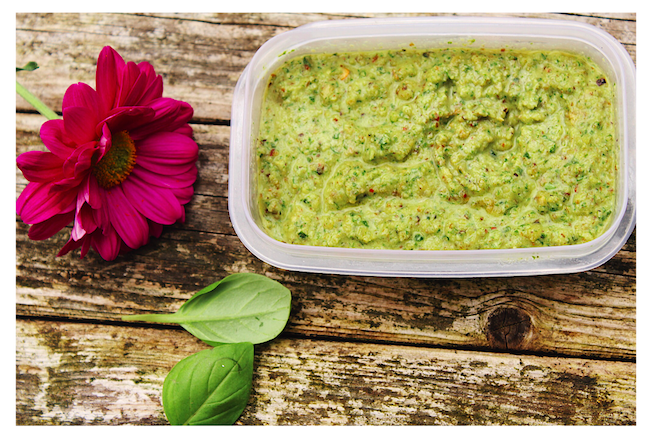 ∞ Fresh Basil (2 cups) ∞ Walnuts (1 1/2 cups) ∞ Lemon Juice (Half lemon) ∞ Olive Oil ∞ Garlic Clove (1 or 2) ∞ Garlic Oil ∞ Fresh Chilli (1) ∞ Nutritional Yeast (1tbsp)